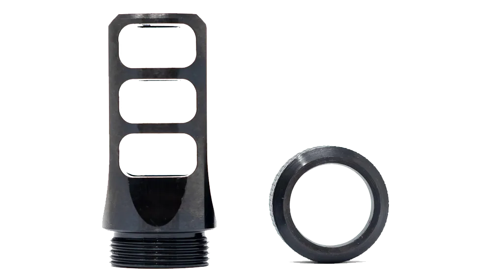 Constructed from high-strength steel and finished with a QPQ nitride coating, the MuzzLok 3-Port Muzzle Brake offers exceptional durability and corrosion resistance. Its three-port design effectively redirects gas to mitigate recoil and muzzle rise, facilitating faster follow-up shots and improved shooting stability. The compact dimensions, measuring 2.456 inches in length and 1.060 inches in diameter (with the MuzzLok nut), maintain a sleek profile that integrates seamlessly with various firearm builds.